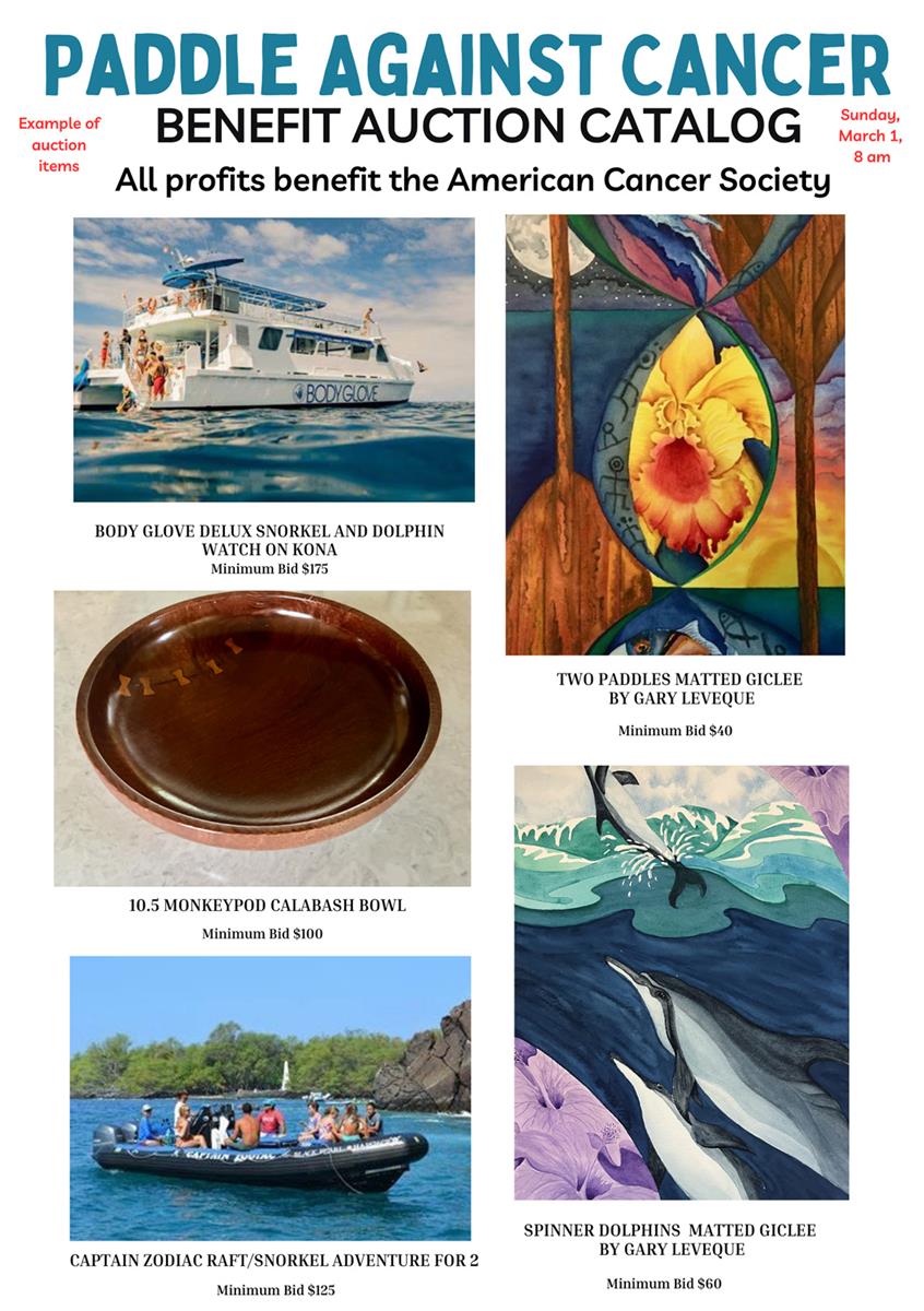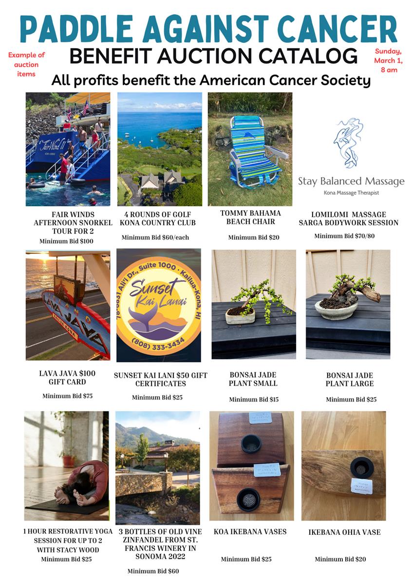 On March 1, 2026, Keauhou Canoe Club is proud to present our 3rd Annual Paddle Against Cancer. This members only benefit event started with a ceremony for those fighting cancer, in remission, and for those who support the fight. The event allows us to recognize and give tribute to those who are/have faced cancer and includes a fun paddle, tasty breakfast and silent auction to benefit the American Cancer Society.